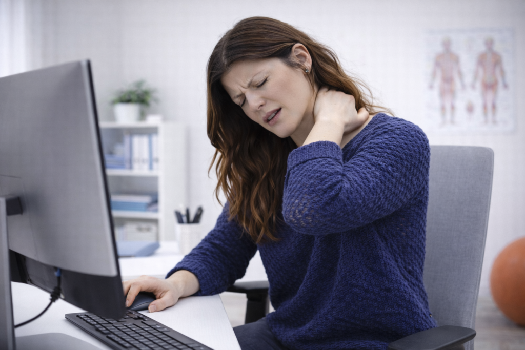 Bij langdurig computergebruik worden de nek, schouders en rug vaak eenzijdig belast. Veelvoorkomende oorzaken zijn: