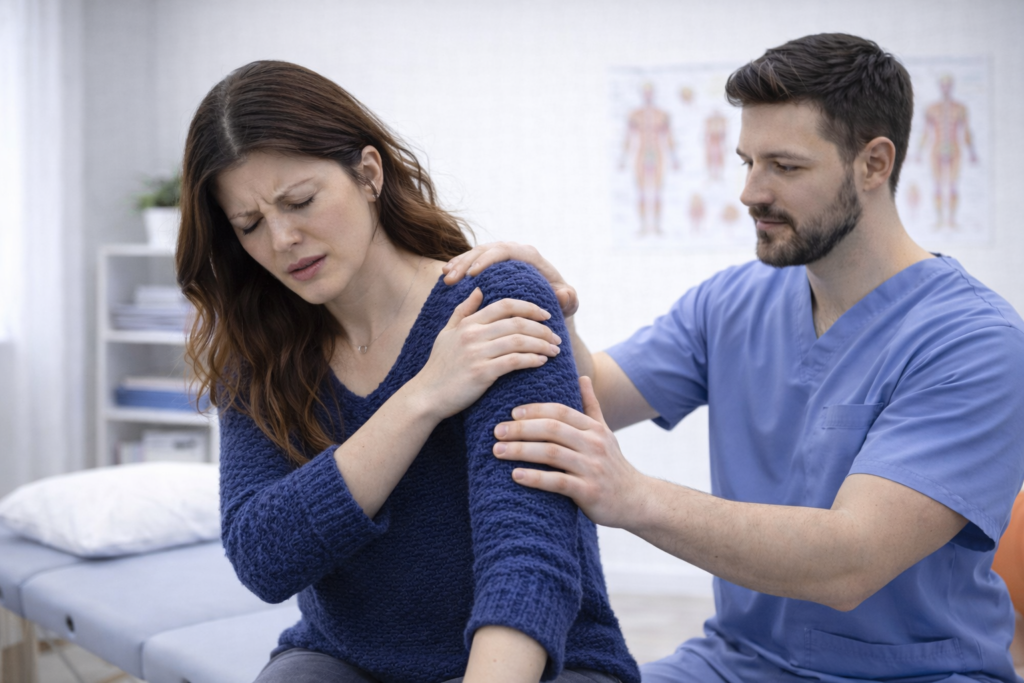 - Nachtelijke pijn, vooral bij liggen op de aangetaste schouder.